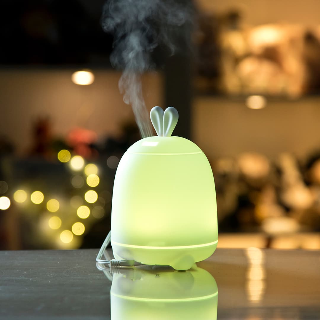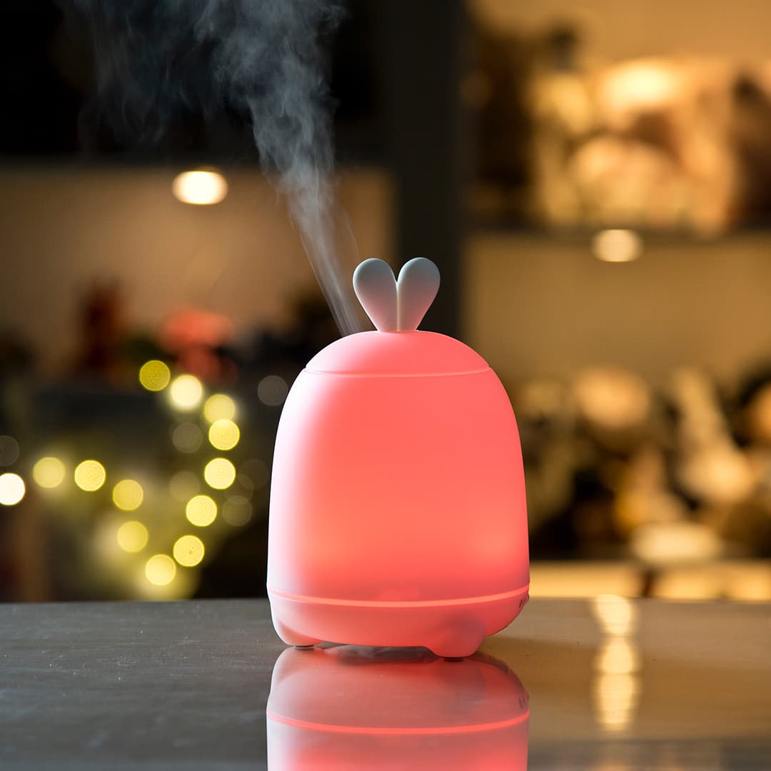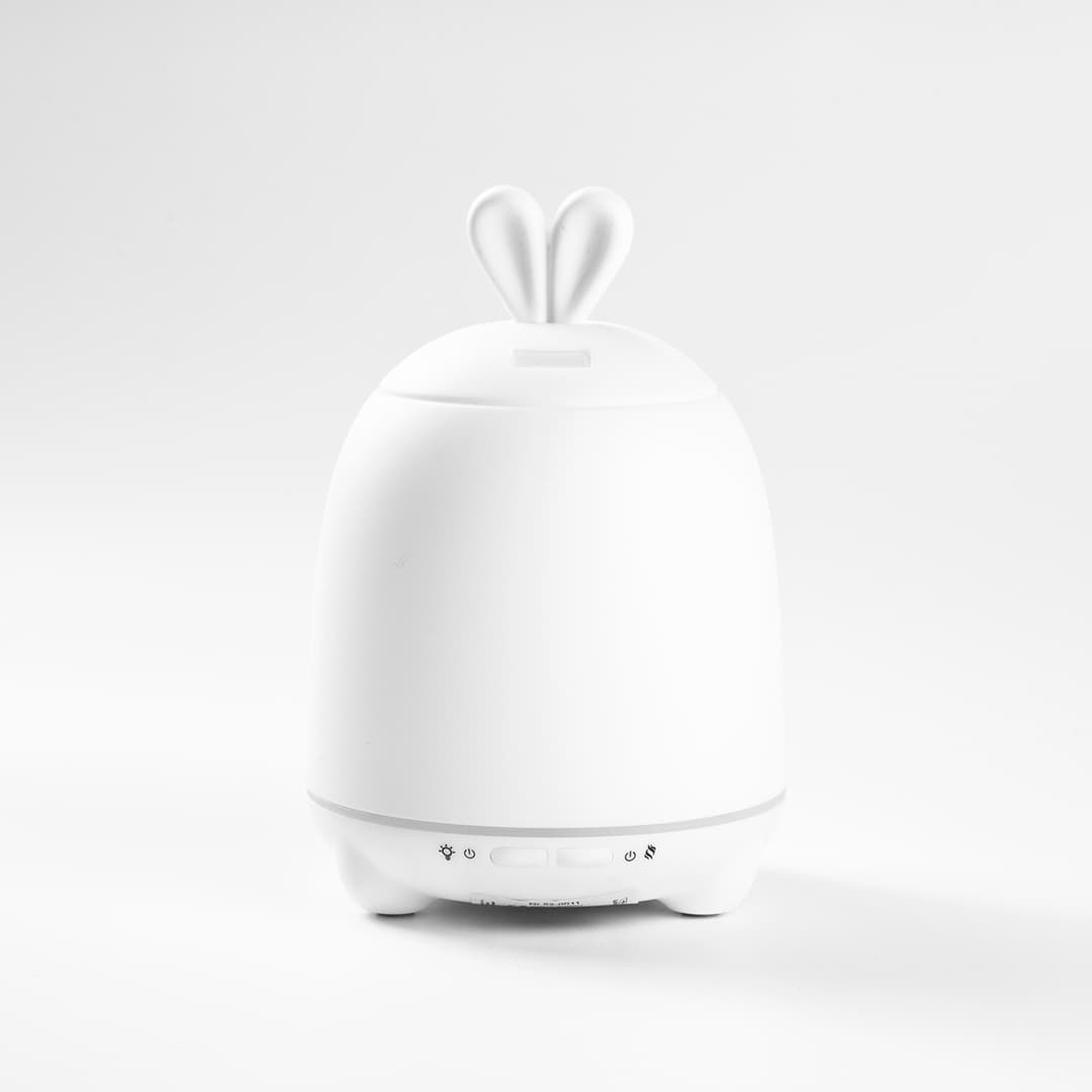 Um Coelho difusor e luz de presença, com orelhas encantadoras é um produto único para oferecer ou para ter em casa. Além de poder alterar a cor e a intensidade da luz, tem também a função de humidificador. Poderá adicionar algumas gotas de óleo de fragrância ao recipiente de água e ter um efeito benéfico e terapêutico. Estes óleos podem ajudar na tosse por exemplo, ou simplesmente a relaxar. Graças ao uso de vapor de água, as propriedades do óleo não se perdem (verifique qual o melhor para a faixa etária da criança).